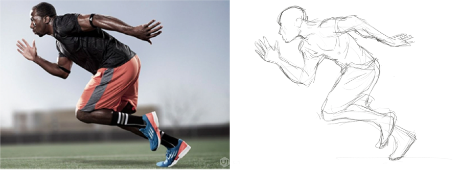 首先依据参考的图片找准基本的人体结构:头、胸、骨盆,可以用简单的线条描绘其大致体态。结构正确即可,不需要绘制出细部特征,尽量保证线稿干净。