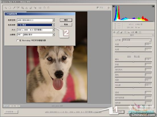 本例中调色与优化部分将在Adobe Camera Raw中进行,调色锐化完成之后在Photoshop中仅对眼睛部分进行细致修复,不再进行整体的大范围调整。因此我们没有必要使用16位通道。在 Adobe Camera Raw窗口正下方,单击标示1所示的设置按钮,在弹出的窗口中将通道设置为8位,如标示2所示。