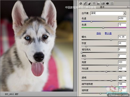 拍摄时是正午时分,狗狗处于伞下,色温比较高,我将色温值放在4150,色调-3,使偏黄的狗狗的颜色变为正常。