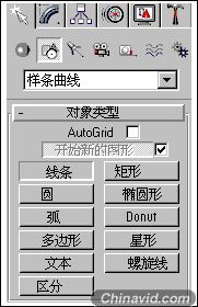(二维图形)按钮,就来到了二维线条创建面板,这个面板有11个创建目录,看右图,它包括创建线条、矩形、圆、椭圆形等等,见右面图,先点一下