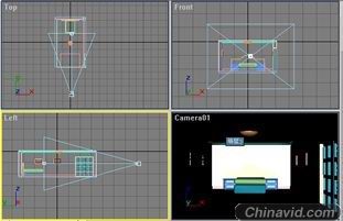1、在右侧的命令面板上单击CREATE/CAMERAS项,单击命令面板上的TARGET钮,在LEFT视图中创建一架摄影机,在几个视图中分别调整它的位置,设置LENS:48、FOV:41,如下图所示。