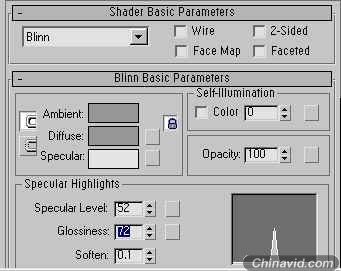 在示例窗中激活第三个示例球,设置阴影方式为BLINN,设置SPECULAR LEVEL:52、GLOSSINESS:72、SOFTEN:0.1,如下图所示。