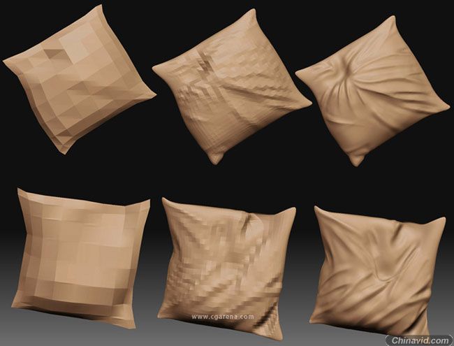 由于我需要靠垫上面有UV,所以在3ds Max中制作了基本网格。 之后将基本网格移动到ZBrush开始塑形。我使用了膨胀刷的LAZY MOUSE选项开始展开,我试着将枕头变形,让它看起来像是被压住了的样子。