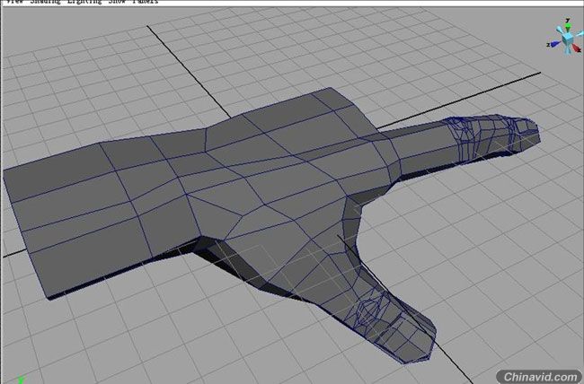 现在,在你觉得你的大型差不多的时候,(当然还是有很多问题的,这需要你在后面的过程中逐步的调整大型)我们为这两根手指做出细节多次要用到 Edit Polygons—Split Polygon Tool工具增加手指的划分,并且用 Edit Polygons—Extrude Face工具来挤压出手的指甲。