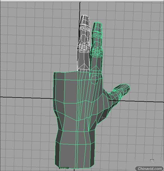 把手指与手掌对位准确后,按Shift同时选住中指和手掌,用Polygons—Combine(合并)命令将起合并在一起,并将手掌上与手指相结合的面删掉。