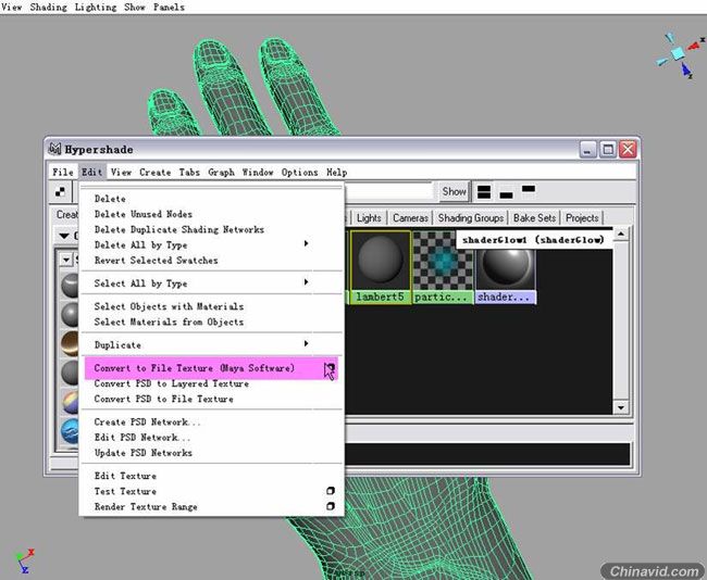 其实现在你就可以通过这张图在画图软件中进行贴图的绘制了,但是为了在绘制中更加的方便我们将对这个物体的UV进行烘陪。其方法是先对该物体给一种材质和一些基本的灯光,然后按Shift键同时选住物体和材质球执行如下命令: