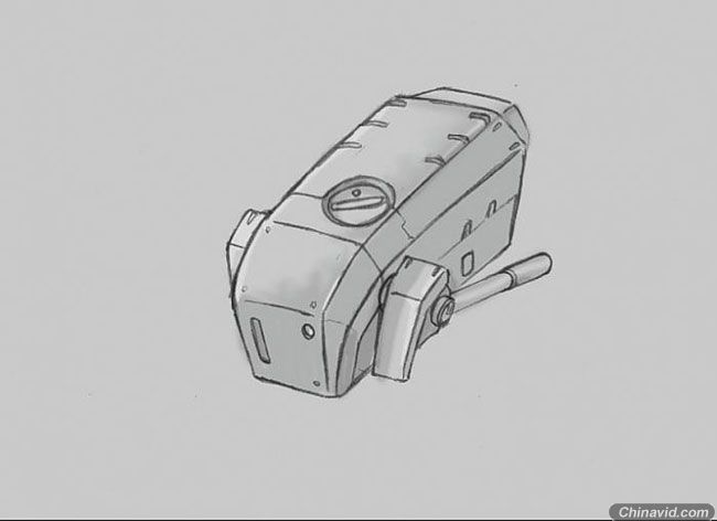 这虽然是一个很基本的机械外形,却已经基本具备了机械的一些简单的外观要素,现在看来是十分简单的,无论是组合还是外观,但是一个复杂的机械,终究归根结底是由这些简单的元素所组成,我们可以对这些元素进行不断地强化,以便于达到我们所需要的效果,这些用于强化效果的元素,仍是我们上面看到的简单元素所构成,设计者需要考虑的是使他们的组合具有合理性,这需要设计者对现实中的事物进行细致的观察,能够了解到一定的机械知识,实际上,无论是幻想中的机械设计还是现实中的机械设计,他们都是有这些最基本的简单的几何元素所构成,唯一能够影响它们合理性的因素,就在于他们组合的方式,也就是说,我们要进行机械设定,需要考虑的是组合的方式,以及所需要使用的几何元素,抓住了这两点,在继续深入细节,就能得出我们所需要的结果了,图2-3所表示的就是图2-2在细节上深入的结果。