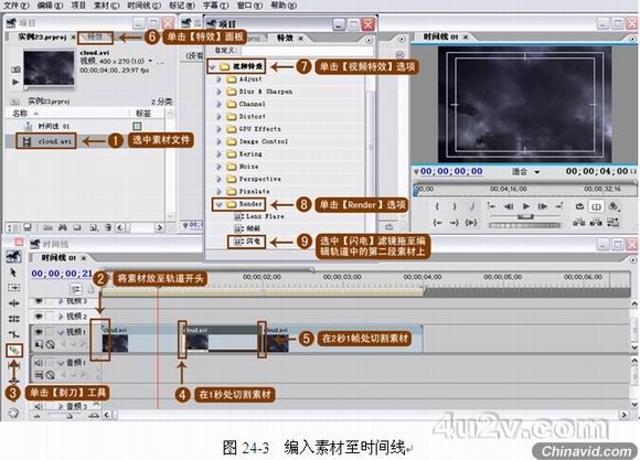 3• 编入素材。把素材文件拖入时间线窗口的编辑轨道中,准备进行编辑,如图 24-3 所示。