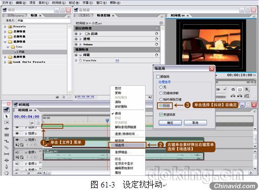 提示:抖动是非常有效的一个命令,它可以平滑因为大小缩放或者其他效果而产生不稳定的画面。另外在图片设定的运动或者添加字幕挂角等时候,画面中的细线或者文字也会出现闪烁抖动,使用此命令可以有效地去除闪烁抖动,使画面符合播出要求。