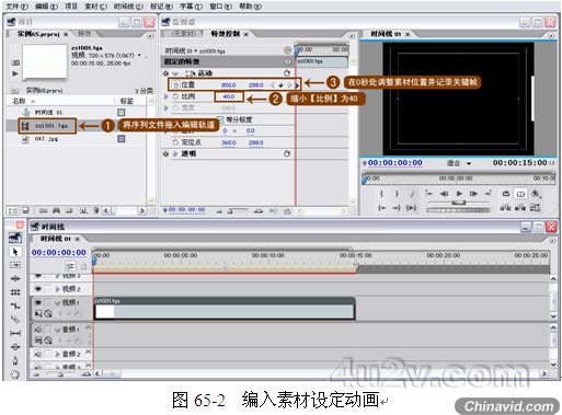 3• 编辑素材。首先编入【 zs1.tga 】序列素材至轨道进行画面横移动画的设置,如图 65-2 和图 65-3 所示。