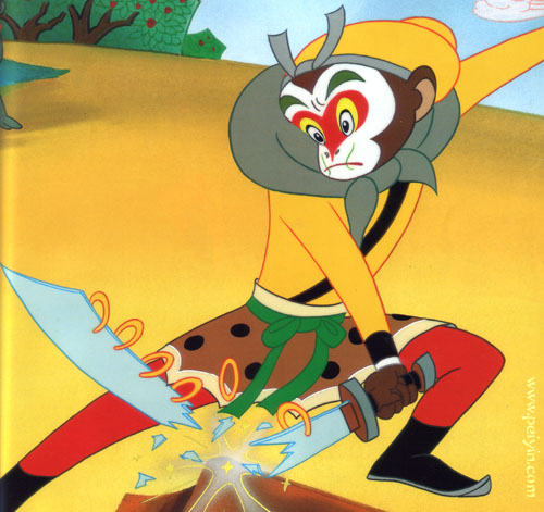 只见猴王舞刀,窜、跳、剪、翻,刚展开几个架式,众猴已看得眼花缭乱,鼓掌叫好。正在开心之处,不料猴王—用力“咔嚓”一声,大环刀折成两段,猴王好不扫兴,掷下刀柄烦恼地道,“哎!俺老孙连一件趁手的兵器也没有,真是扫兴得很呐!……”