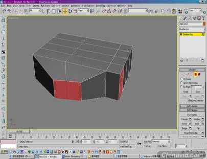 在物体级别面模式下选中图中所选的面,使用Modify面板的EdiPolygon卷展栏上的挤压命令对面进行向内挤压。
