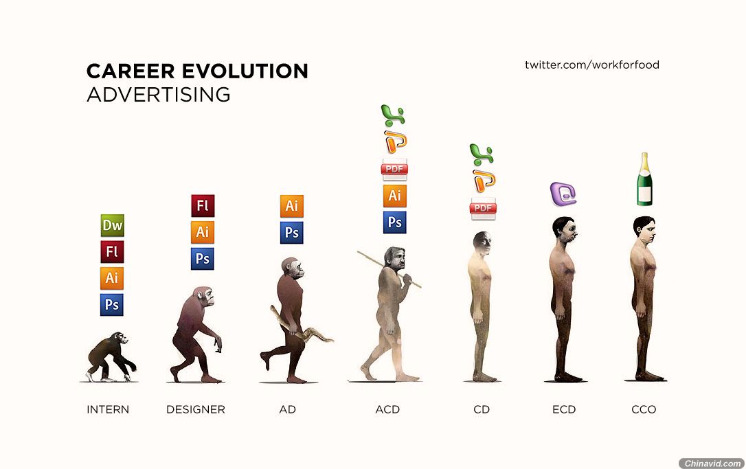 广告职业阶梯,不同的职位做的事各有不同,为了谋生而工作,年轻人不得不从最底层做起: