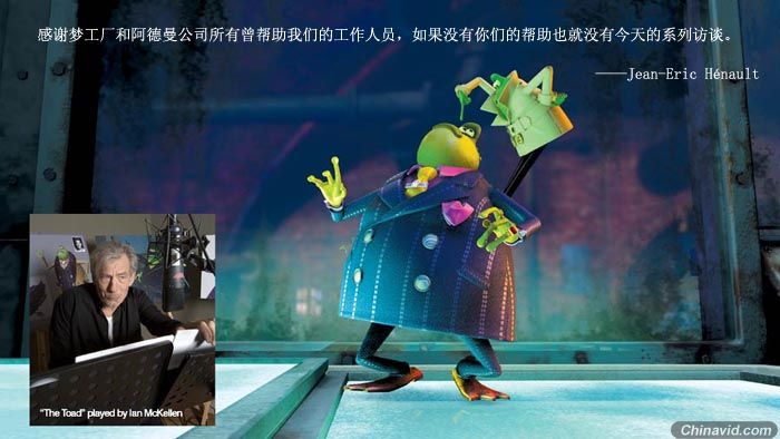 Jason:从技术上讲,Toad是最难实现的一个角色。你很难给它摆造型,因为它的体型很大,而且面部构造比较复杂,但是它的表演动作对我而言却很平常(我想这也就是他们让我制作Toad的原因)。如果说上升到演技的层面,我希望能够尝试更多Rita出现的镜头,Simon Otto在此处干得相当漂亮。Rita的动画设计很复杂也很微妙,充满了诱惑力,我多么希望也能有机会尝试一下这种人物角色的制作,挑战一下自我。
