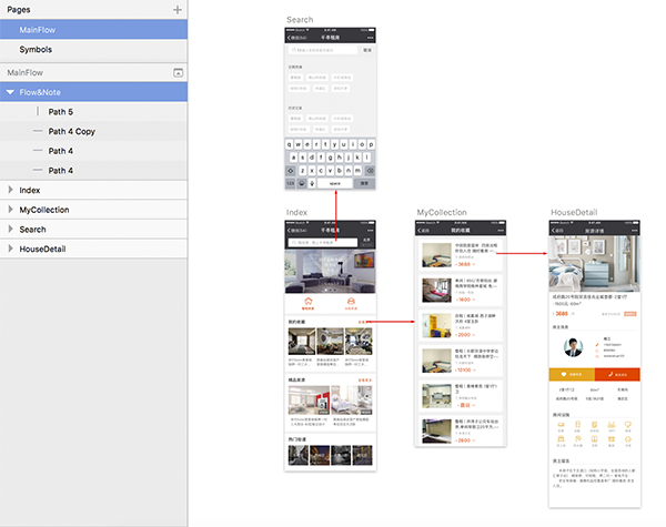 还有一点需要注意的是,在sketch文件里面,为了将页面跳转流程表示得更加清晰,设计师会在最顶层加一个额外的Artboard,主要用来画流程线,和一些信息备注。如下图Flow&Note的Artboard。